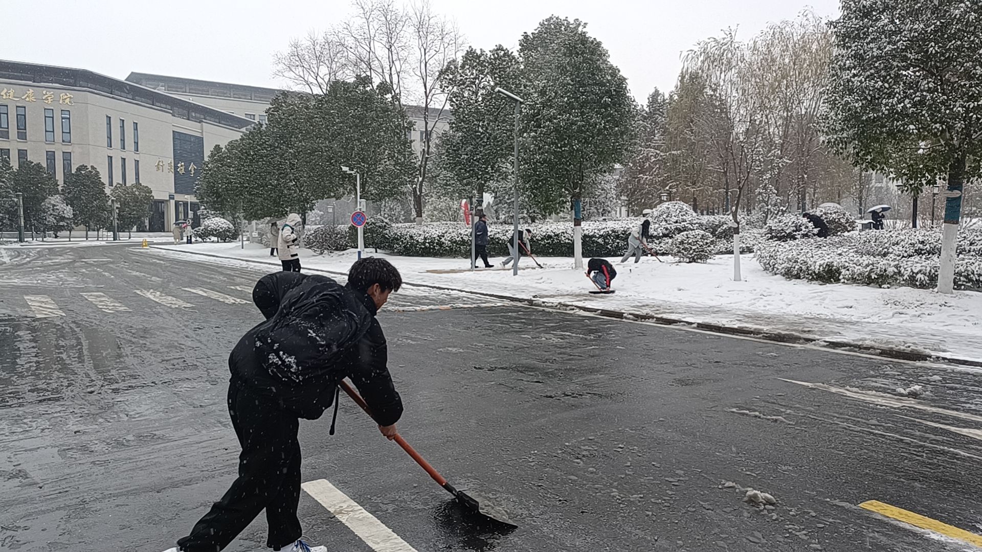 面对突如其来的大雪,公司积雪严重,道路泥泞打滑,存在严重的安全隐患,公司组织志愿者们开展除雪扫雪活动,将行政楼至食堂的道路,以及图书馆前的积雪清除,让同学们体验到了一场别开生面的志愿服务活动。(张健/文图 吴成长/审核)