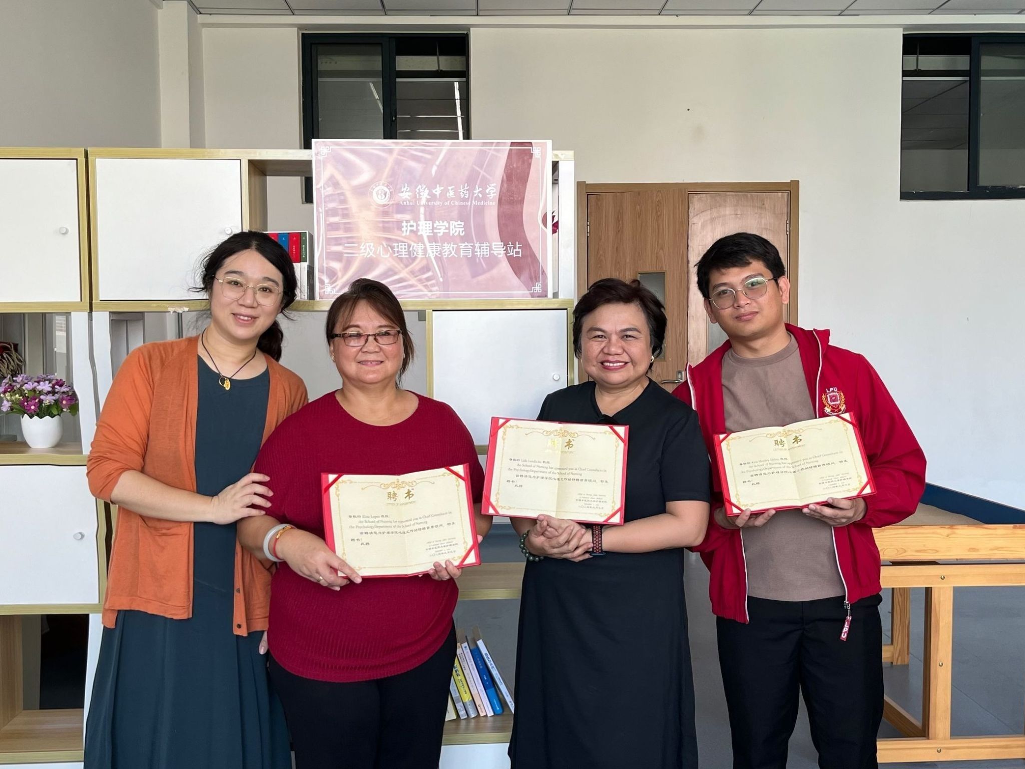 Lida C. Landicho教授一行与心理健康工作站刘维婷老师就目前工作站的主要工作,存在的相关问题以及将来工作的方向进行了相关交流。特别是关于心理活动室的建设及心理沙盘等心理活动的策划,提出了许多具有建设性的意见。