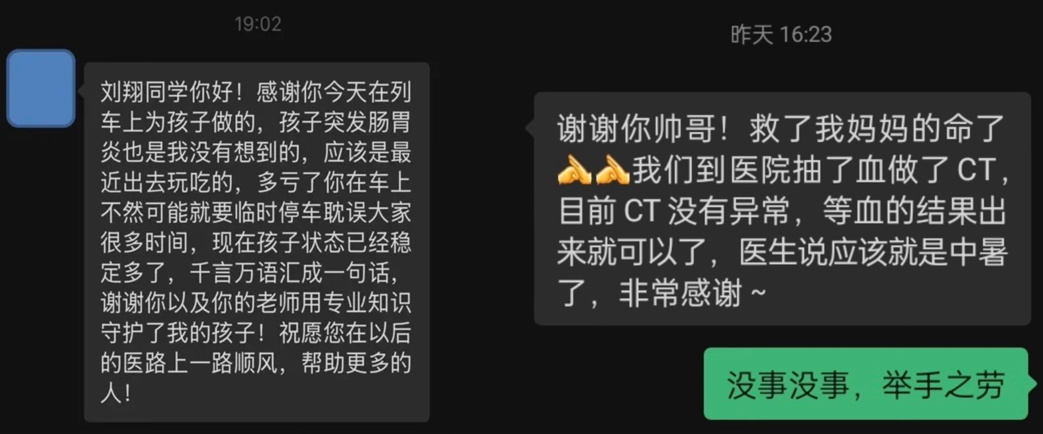 近日,由阜阳开往合肥的K1071次列车上,车站广播传来了紧急求助。危急时刻,身处在6号车厢的2022级护理专业7班刘翔同学听到寻医广播后紧急赶到现场,联系老师“云会诊”,运用中医穴位按摩为孩子缓解疼痛,暖心一幕引发乘客点赞。