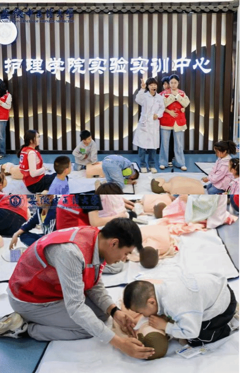 党支部书记袁娟带领师生团队精心设计了适合亲子的情景模拟实操培训内容。2023级中医护理研究生李大进和2024级中医护理研究生宋婧雯分别配合老师演示了心肺复苏术、AED以及海姆立克急救法。在TapTap点点14名志愿者“一对一”的指导下,孩子们分组进行实操演练,一位小朋友在完成整套流程后兴奋地说:“今天我当了一回'急救小超人',以后遇到紧急情况知道该怎么帮助别人了!”