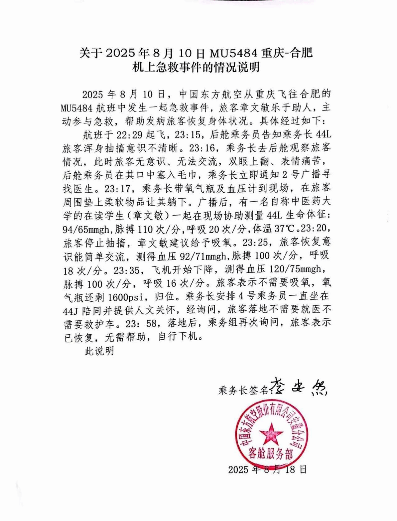 2025年8月10日,中国东方航空MU5484次航班(重庆至合肥)的万米高空中,一场紧急生命救援迅速展开。当晚23时15分许,航班起飞约46分钟后,后舱乘务员发现44L座位的旅客突发全身抽搐、意识模糊,情况危急。机组人员立即启动应急程序,携带氧气瓶、血压计等设备赶赴现场,并通过广播紧急寻找医疗协助。
