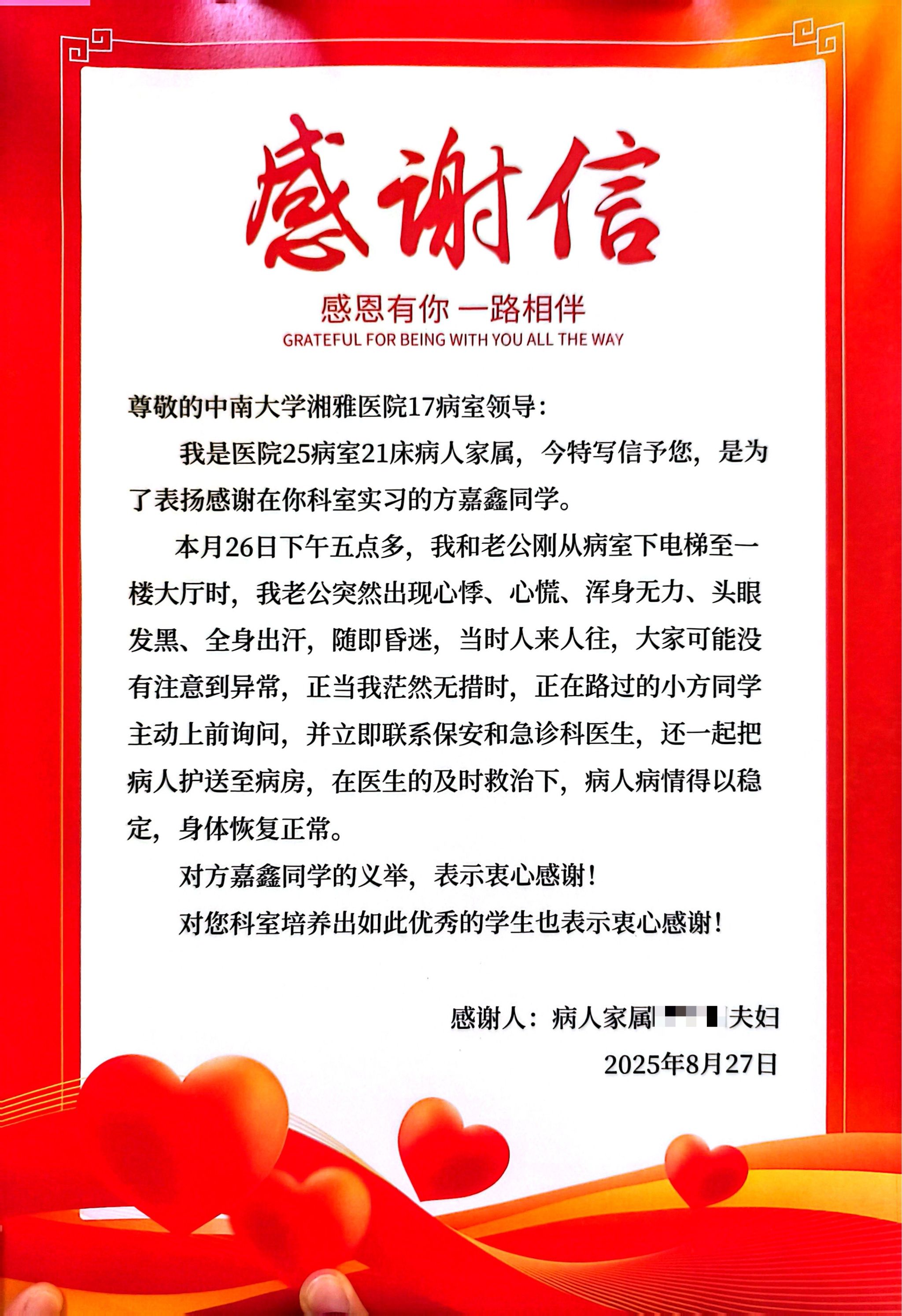 2025年8月26日,中南大学湘雅医院住院部一楼大厅突发紧急一幕,一名中年男性患者突然晕倒在地,面色苍白、全身冷汗,家属惊慌呼救。正当人群慌乱之际,2022级护理学专业实习生方嘉鑫挺身而出,冷静处理,为生命护航。