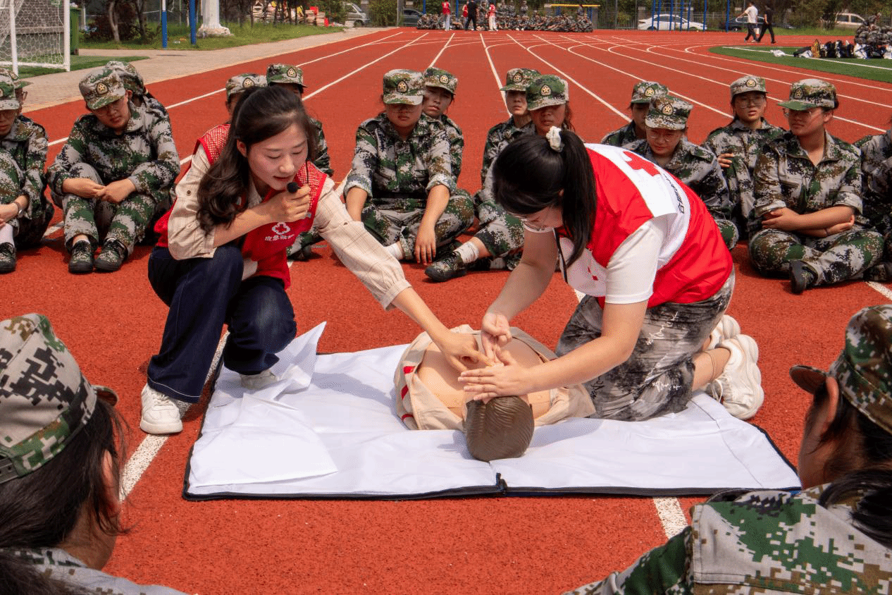 军训现场,教师团队一改专业术语的堆砌,采用“案例+原理”的通俗化讲解方式,深入浅出地阐释急救的现实意义,并重点演示了心肺复苏(CPR)操作流程与自动体外除颤仪(AED)的使用方法。随后,校红十字会与TapTap点点青年志愿服务队的志愿者们在老师带领下,借助模拟人和训练AED,分步展示CPR与AED的实际操作技巧。在练习环节,同学们在教师一对一指导下,逐步演练胸外按压和人工呼吸。从按压深度、频率的把握,到急救姿势的标准调整,老师们耐心纠正每一个细节,帮助同学们夯实操作逻辑、筑牢技能基础。