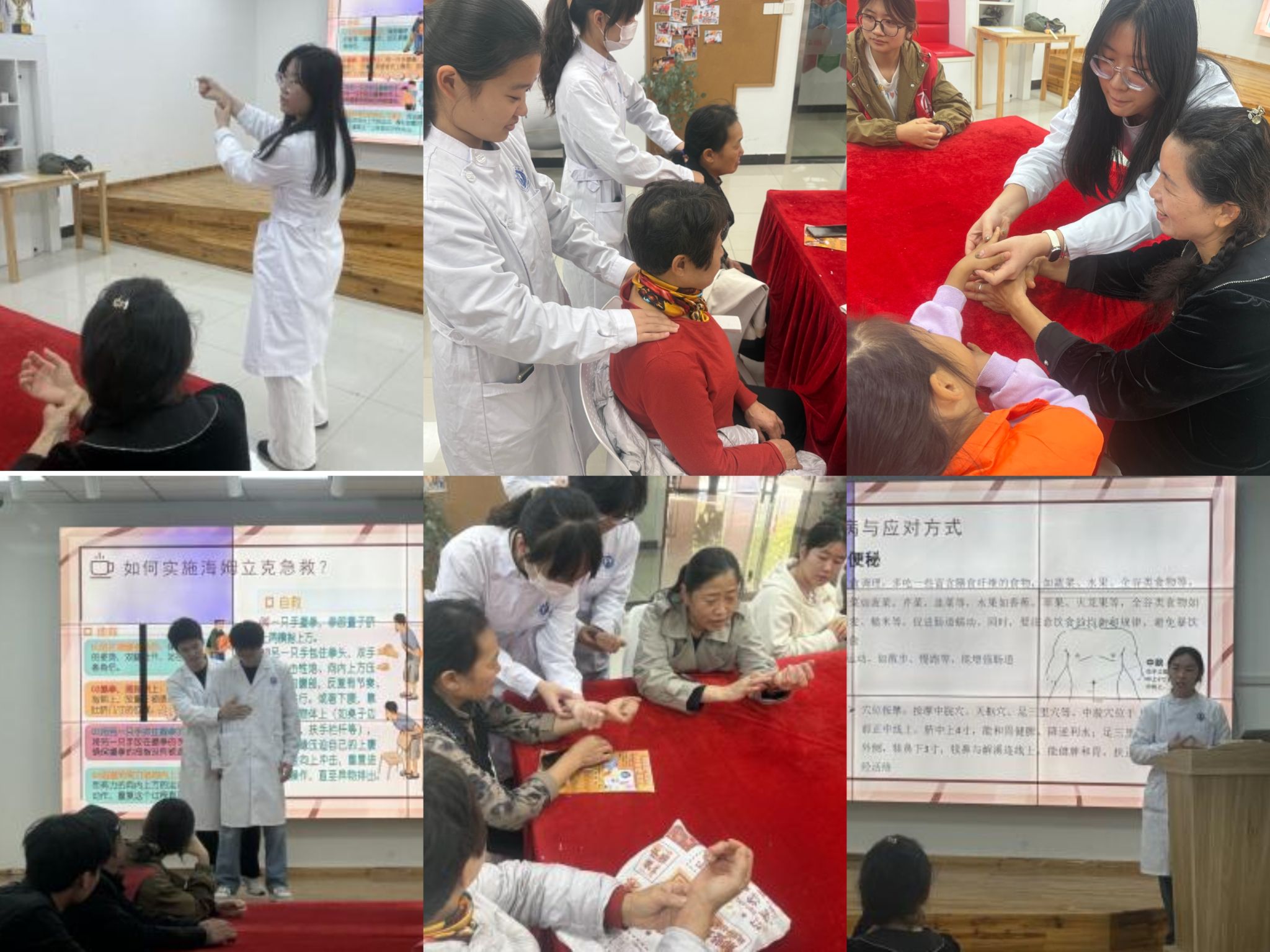 活动现场,志愿者们首先围绕老年人常见的摔倒与噎食问题,详细讲解了相关预防措施,现场演示了海姆立克急救法的规范操作。在互动环节中,邀请居民亲身参与、动手实践,让急救知识 “入耳入手”,增强了老人们在突发情况中的自救与互救能力。针对老年人普遍关注的失眠、便秘、高血压等健康问题,志愿者结合中医养生理念,现场指导老人定位并按摩关键穴位,提供科学的养生小妙招。此外,志愿者们还精心准备了具有安神助眠功效的中草药香囊,赠予现场老人,传递一份温暖与关怀。