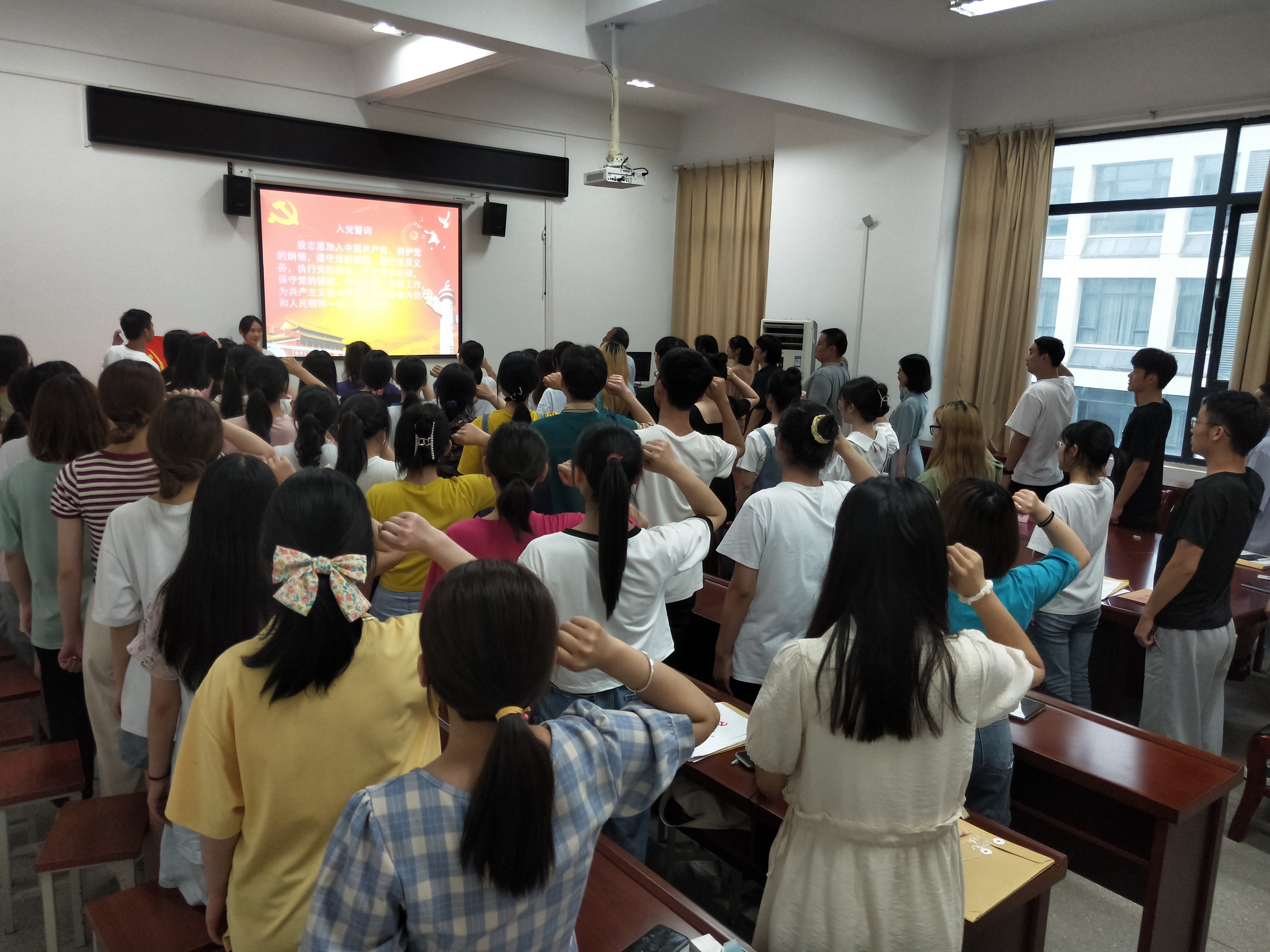 谈话结束后,全体党员佩戴党员徽章,在吴成长的带领下,高举右拳,面向党旗,庄严地进行了入党宣誓。