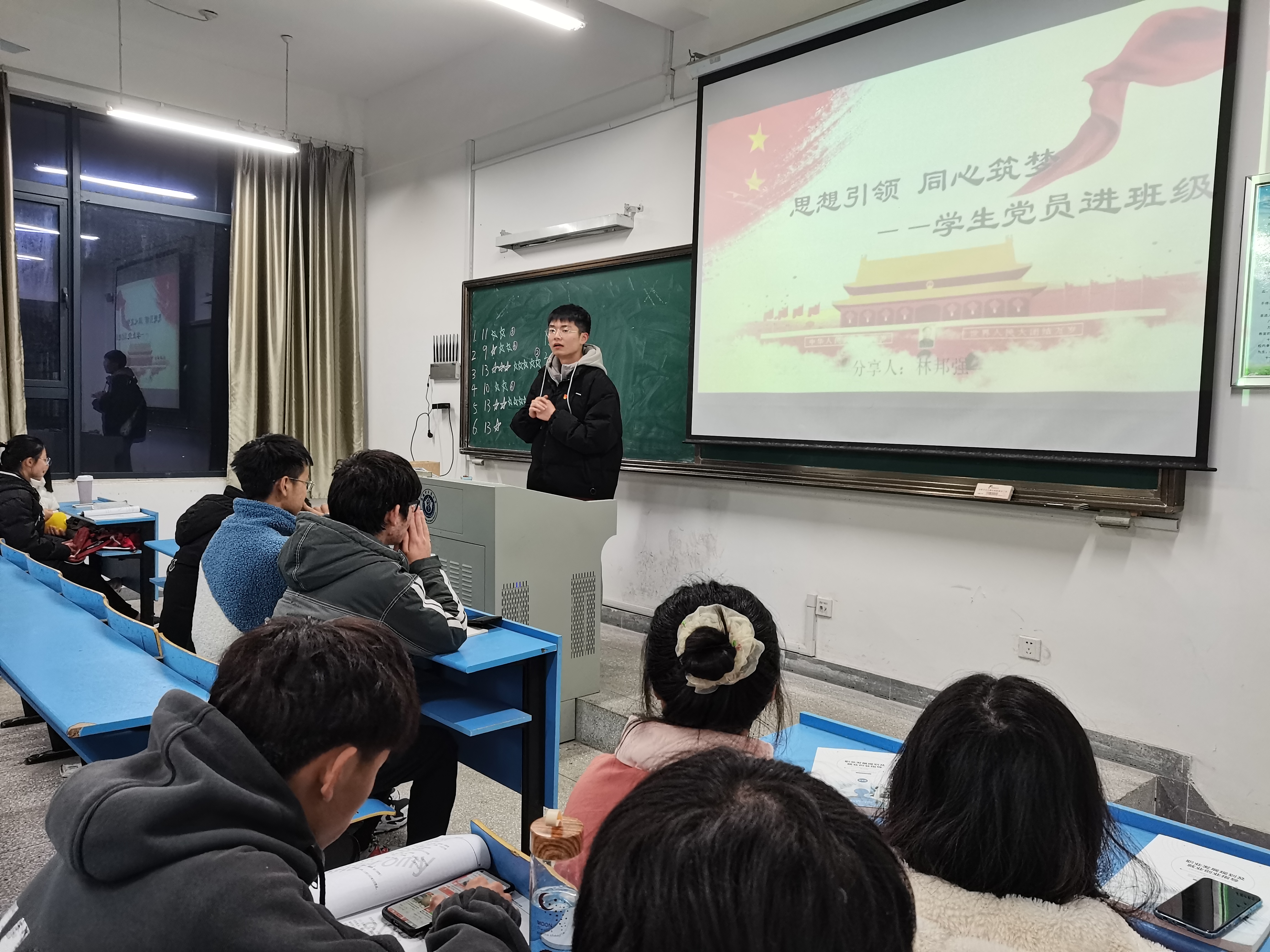 林邦强以“志存高远,追随榜样脚步”为主题,讲述了从入学至今,在榜样的引领下一步步前进,并通过三个自身的小故事分享给20级新生六字箴言——“尝试”、“坚持”、“奉献”。林邦强最后引用了爱因斯坦的一句话“一个人的价值,应该看他贡献了什么,而不应当看他得到了什么”,告诫同学们不能成为精致的利己主义者,鼓励大家积极向党组织靠拢,从群众中来,到群众中去。