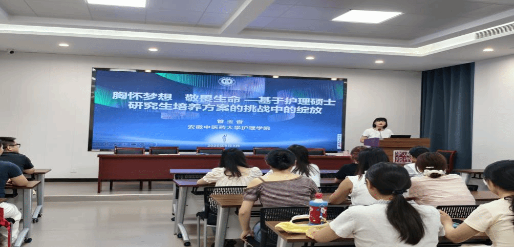 紧接着,管玉香为新生们带来了一场题为《胸怀梦想,敬畏生命——基于护理硕士公司产品方案的挑战中的绽放》的专题讲座。她详细解读了护理不同类别硕士研究生的培养目标、课程体系、实践要求以及学位标准,帮助新生们全面了解未来的学习任务,并科学制定三年读研规划。她结合生动案例,深刻阐述了“胸怀梦想”与“敬畏生命”的护理职业内核,鼓励同学们勇于面对挑战,在科研与临床的磨砺中绽放青春光彩,实现人生价值。