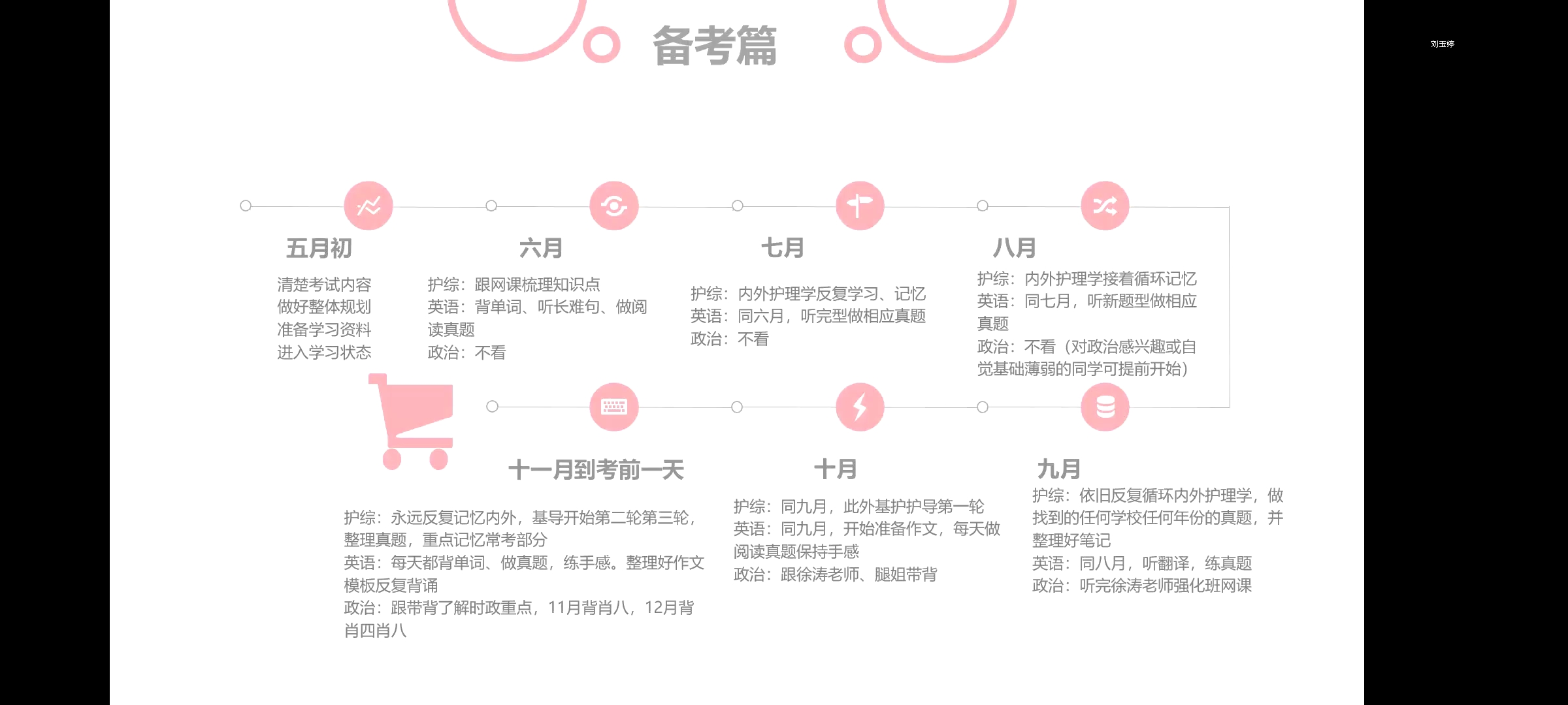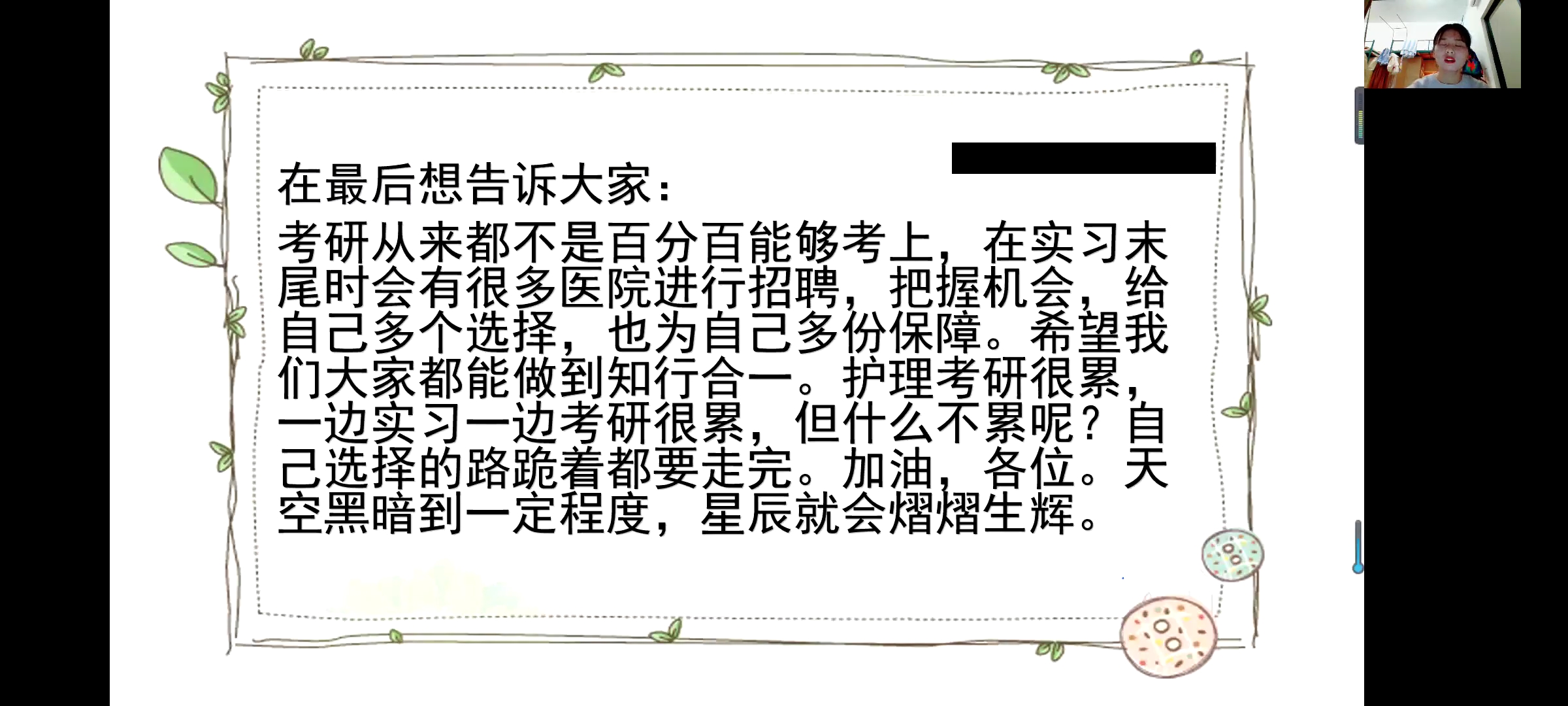 2018级护理学2班的刘玉婷同学和2018级护理学7班的房凡同学,结合自己实习与考研经历,分别从“考研与实习动态平衡”和“备战考研计划”,向同学们分享各自考研心得,包括笔试复习、考研心态和复试技巧等。2018级护理学6班的钱君辉同学,结合自身求职历程,向同学们分享了心得与经验,求职过程中要做好“就业信息”的搜集,积极参加各类招聘,保持积极乐观的就业心态。