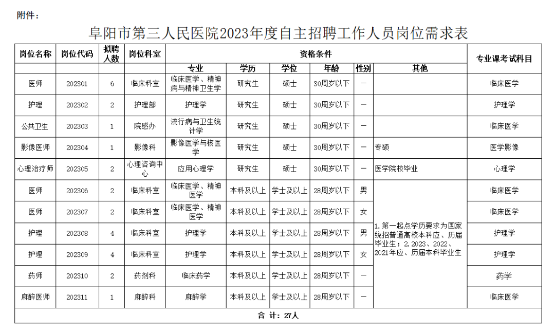 阜阳市第三人民医院2023年度自主招聘工作人员27名,招聘计划(岗位)等信息详见附件。